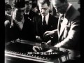 Mussolini, chino sulla macchina, ne osserva il funzionamento, sotto lo sguardo di altre personalità
